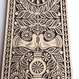 ve086 リトアニア 伝統工芸の壁飾り Verpste ベルプステ 焦茶ベース 約幅16.5cm×縦62.5cm 向かい合う2羽の鳥