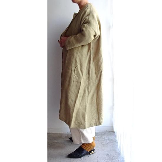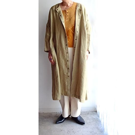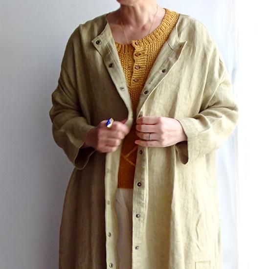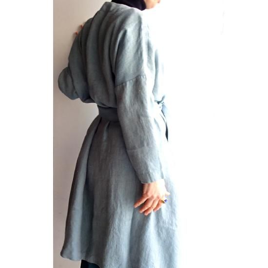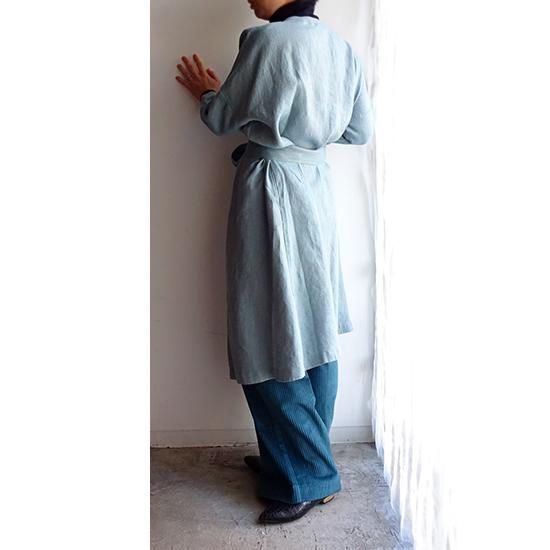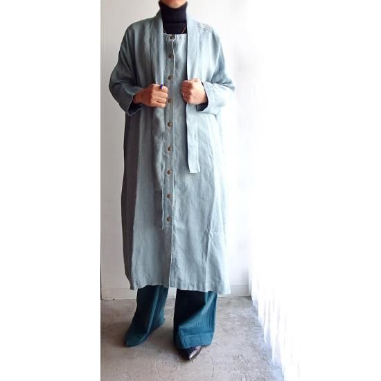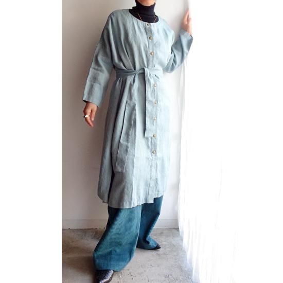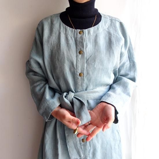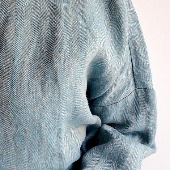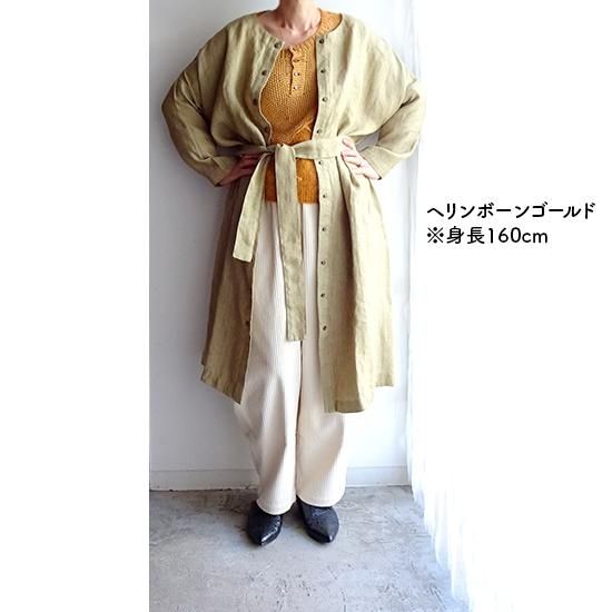やわらかなヘリンボーンリネンをたっぷりと惜しみなく使ったドロップショルダーの前開きワンピース。
