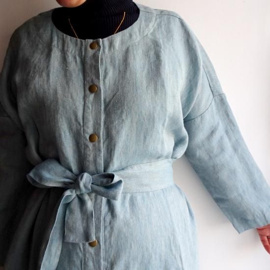 前を開いてワンピースやTシャツ&ジーンズの上から羽織ったり、スナップボタンを全部しめて共布ベルトでウエストをキュッと結ぶとワンピーススタイルに。