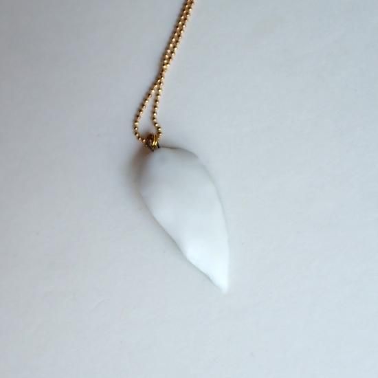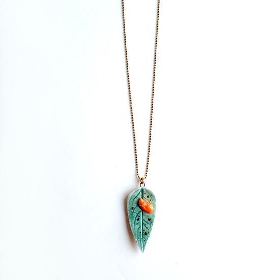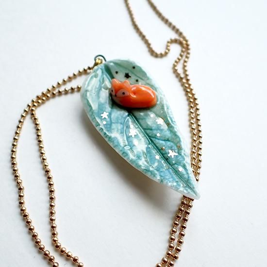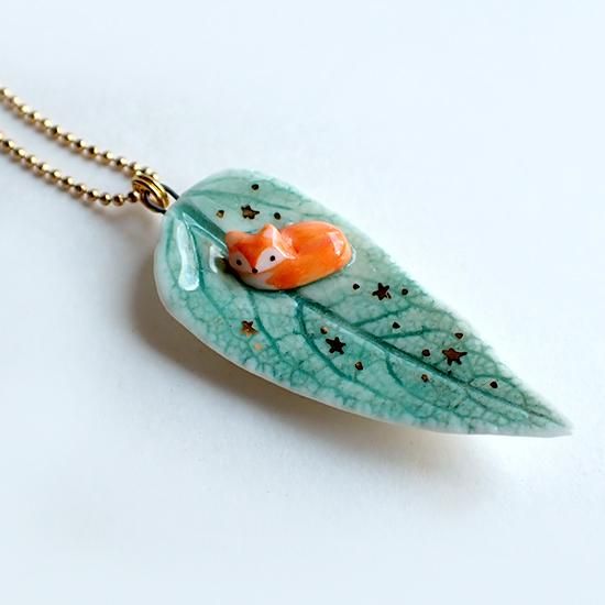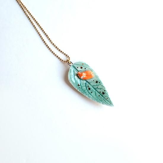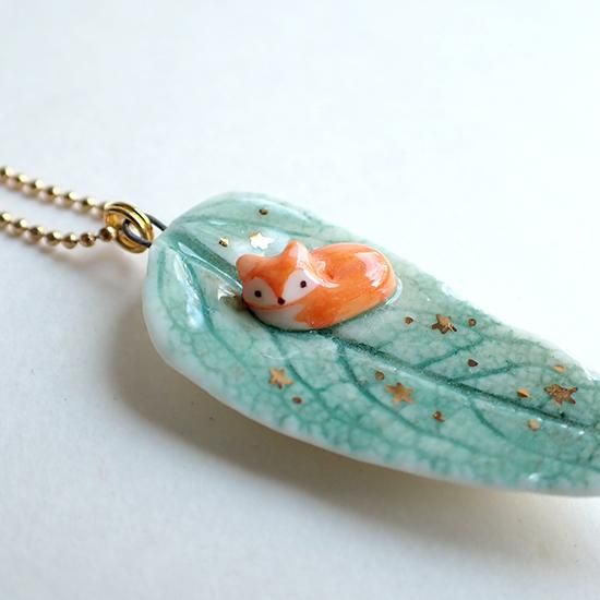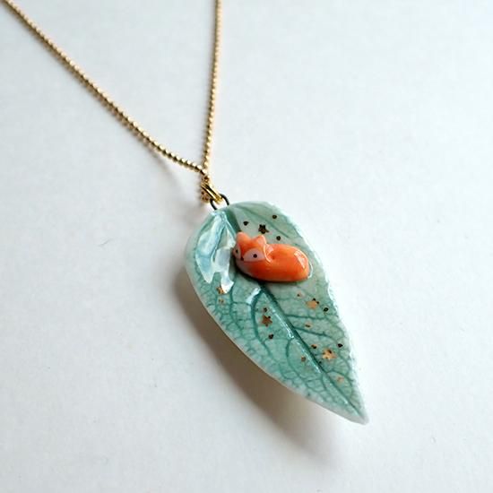 ecl016 リトアニア Lauraの手仕事 磁器のネックレス 葉っぱの上にちょこんとたたずむ小さなキツネ