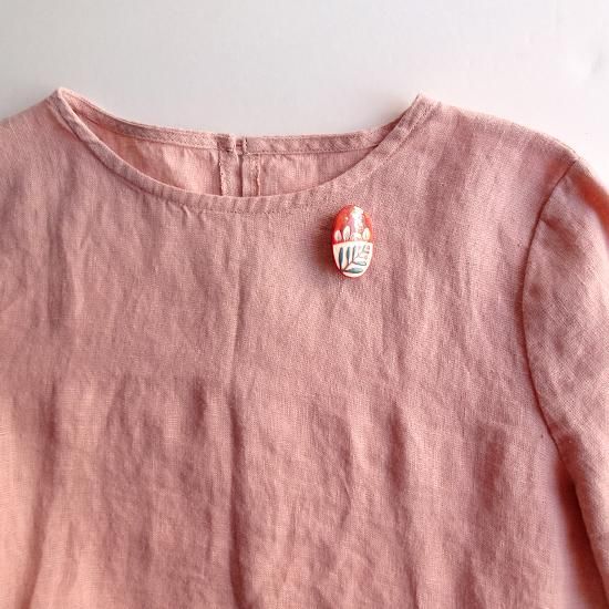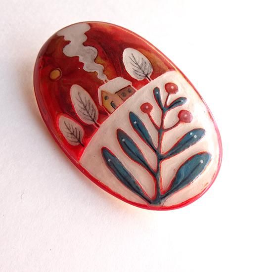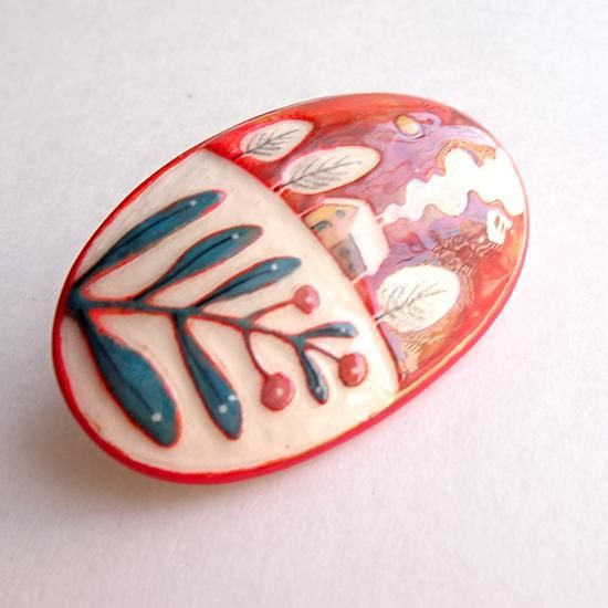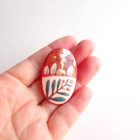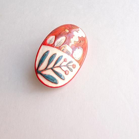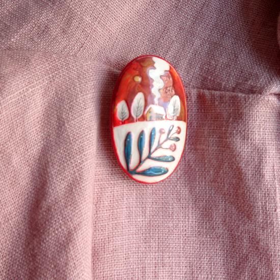 adm904 リトアニアの陶器作家Adomasのブローチ 夕闇のオレンジの空、もくもくと煙の出るおうち 約2.5×4cm