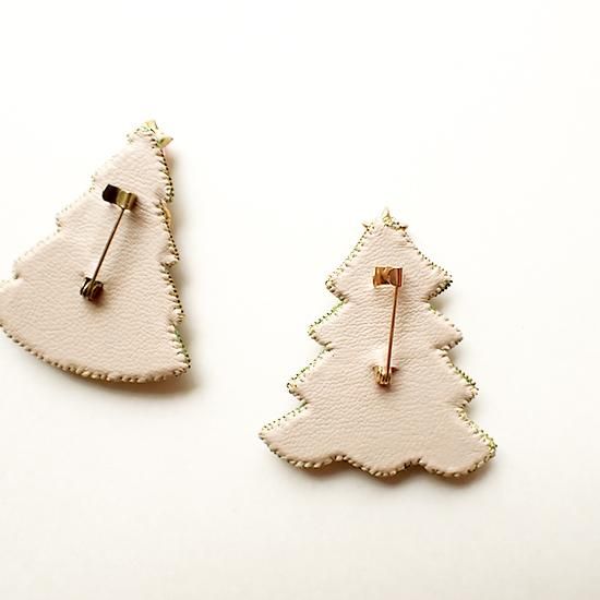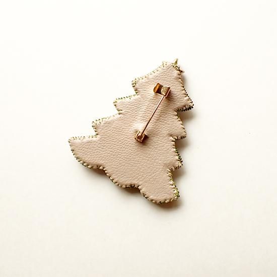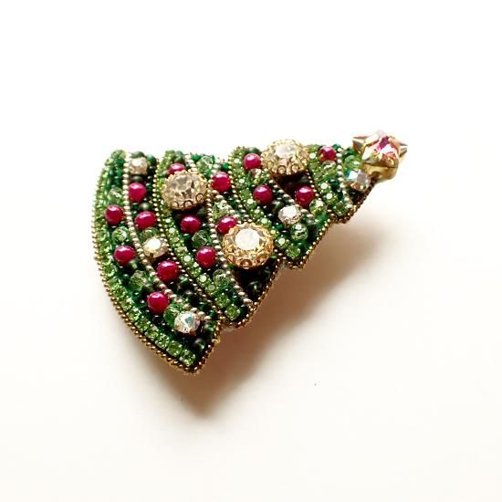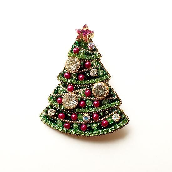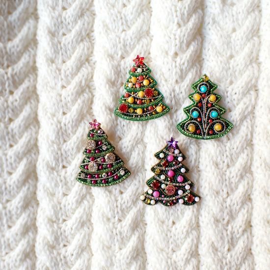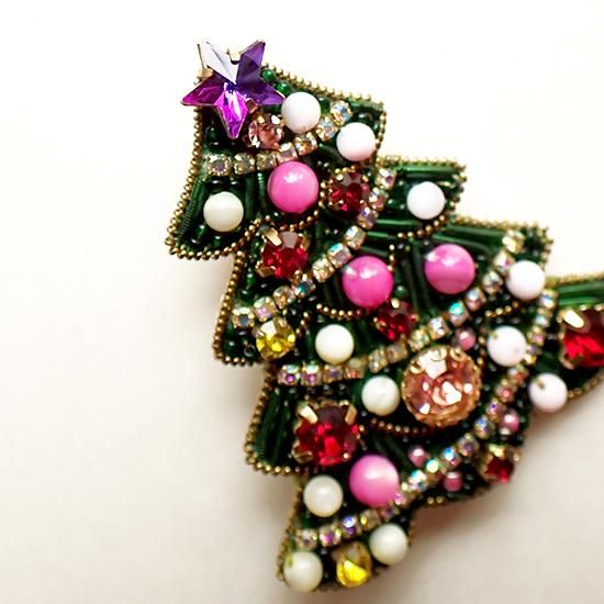 小さなビーズがぎゅっと敷き詰められたクリスマスツリー。キラキラと輝くパーツが胸元やバッグのワンポイントに。
