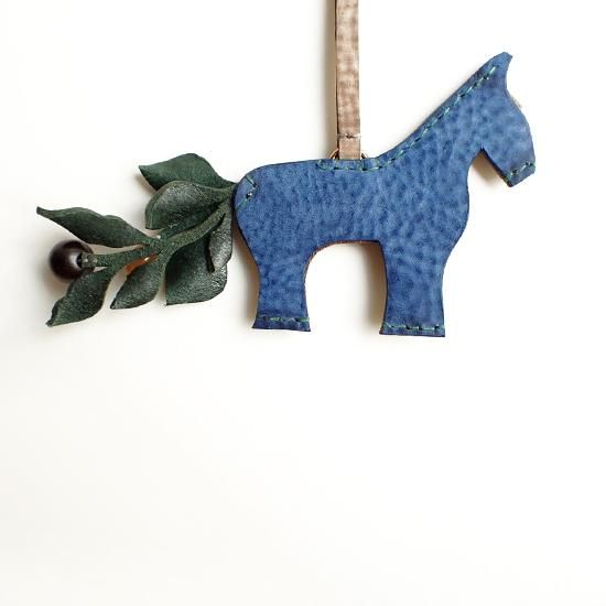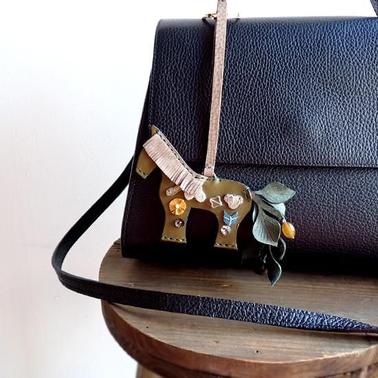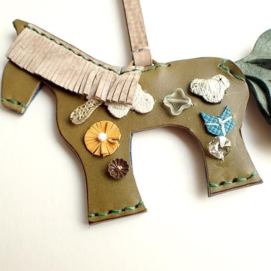 草花を形どった立派な尻尾が躍動感のある馬のチャームブローチ。体にはビーズや革のパーツが散りばめられゴージャスに彩られています。