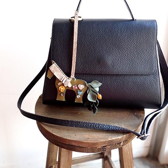 革のバッグにはもちろんのこと、あえて布製のエコバッグにつけるのも楽しい。夏にはカゴバッグ、冬にはファーバッグとのコラボも楽しめます。