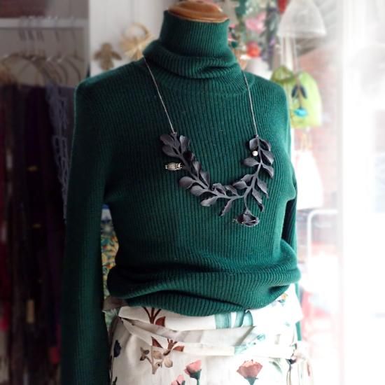 切り出した草花モチーフが胸元で揺れるデザイン。タンニンなめし黒革にワックスがかかった美しい革はシャープなイメージもあり雰囲気がありとってもオシャレ。草花を身にまとうような気持ちで身につけたいネックレスです。