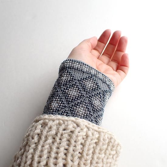 rie025 リトアニア ビーズ編みのリストウォーマー RIESINES グレーにチャコールやホワイト系ビーズ柄 約幅8cm×長さ12cm