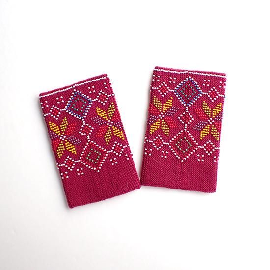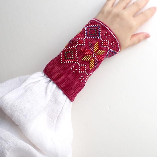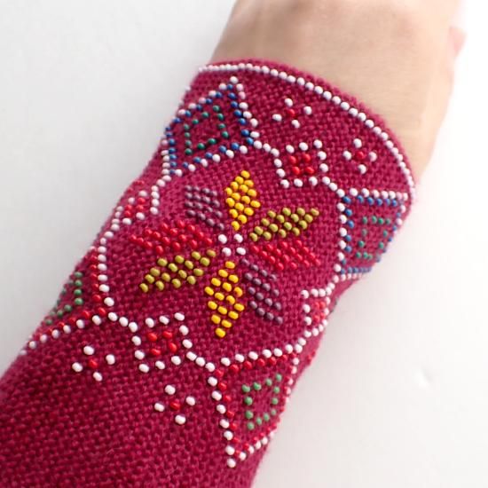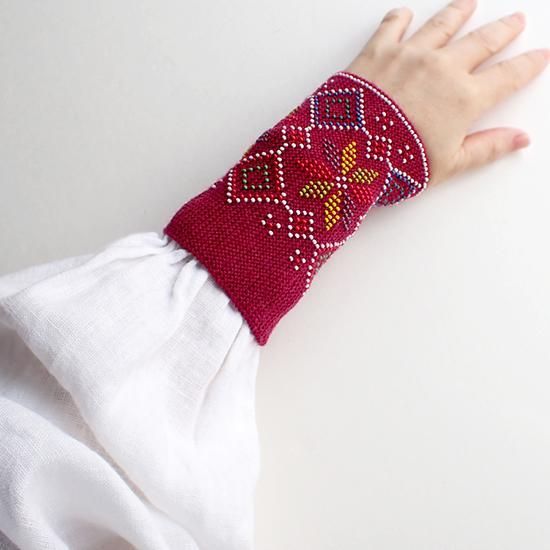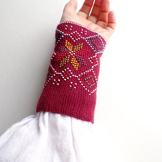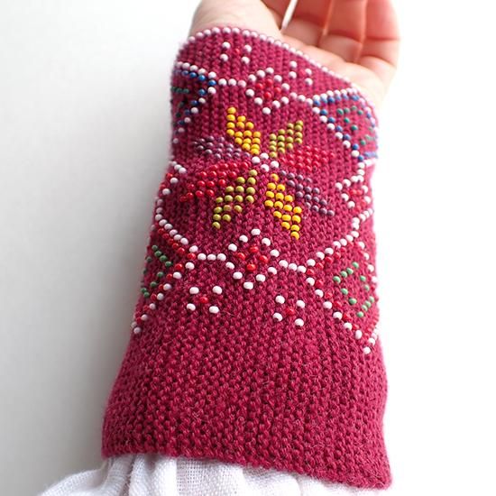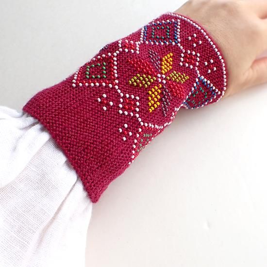 ニットにビーズで模様を編み込んだ、美しいリストウォーマー。リトアニアでは、昔から民族衣装に合わせて身につけていた伝統的な装飾品です。