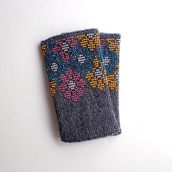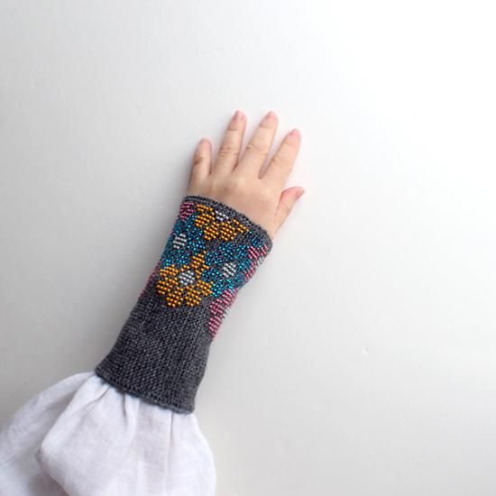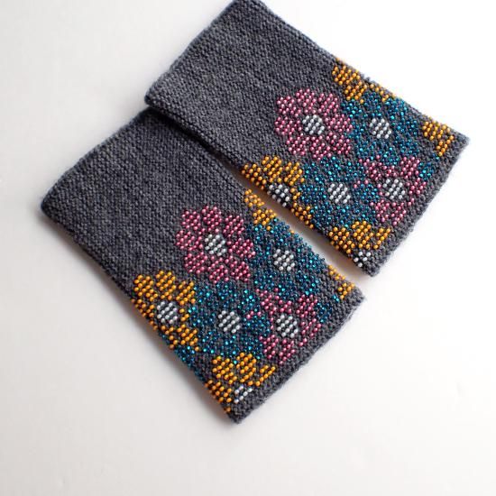 rie027 リトアニア ビーズ編みのリストウォーマー RIESINES グレーにピンク、ブルー、イエローのお花柄ビーズ 約幅8.5cm×長さ14.5cm