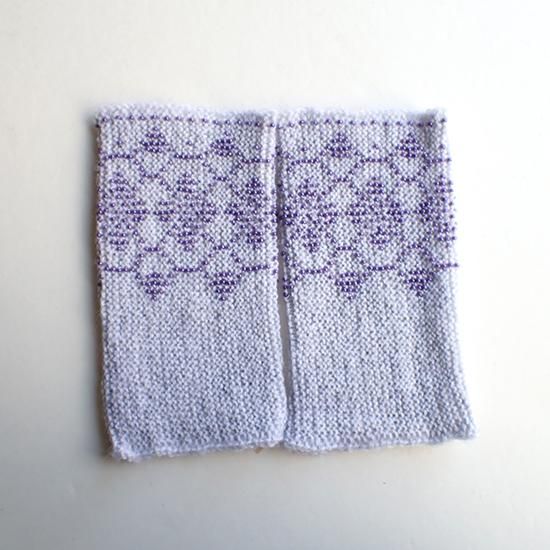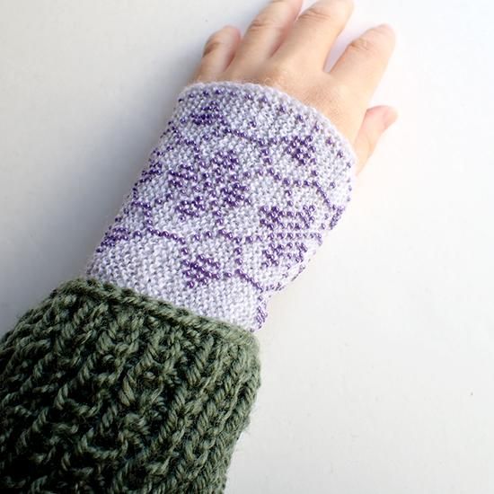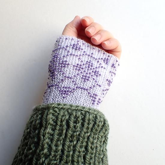 rie030 リトアニア ビーズ編みのリストウォーマー RIESINES 薄グレー地にラベンダー色ビーズ 約幅8cm×長さ13.5cm
