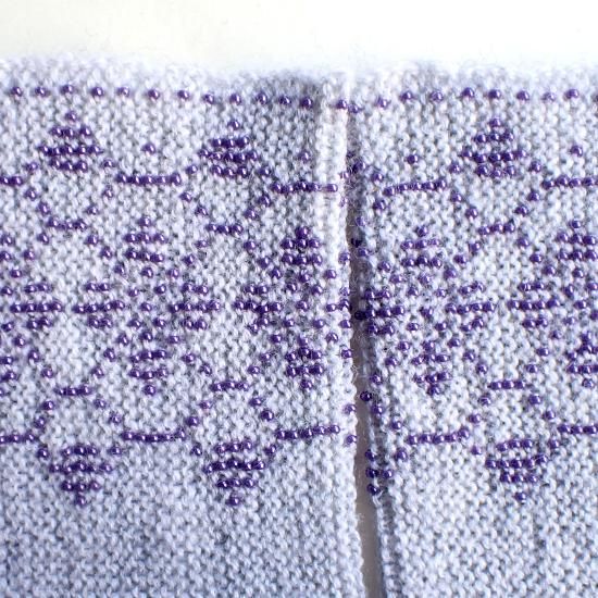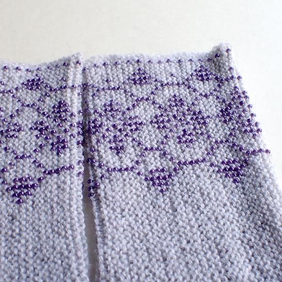 びっちりと細かなガーター編みにキラキラ輝く小さなビーズが編み込まれており、手に取るとうっとりと眺めてしまう、まるで芸術品のような美しさです。