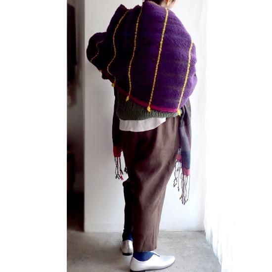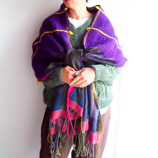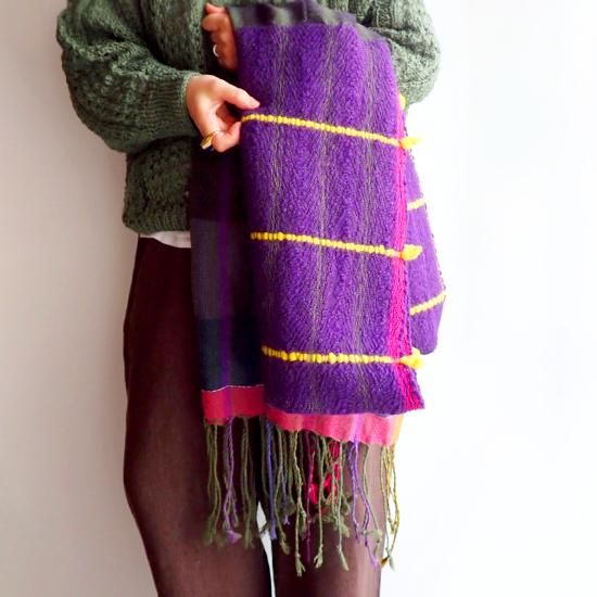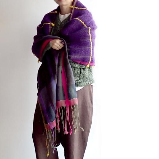 コーディネートの中心になるパープルの色合いは冬の暗くなりがちなコーデに花を添えてくれます。ポイントに織り込まれた黒やグリーンのパキッとカラーがポイントになり、色々な表情が楽しめます。