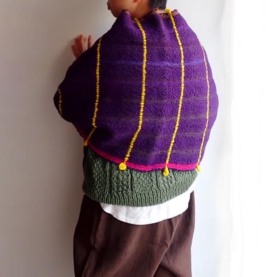 肌寒いときには肩からかけるとちょうど肩周りにウールの部分がかぶさりとても暖かく、両端のリネン部分はフロントで結びやすくなっています。